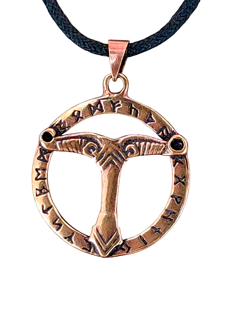 Sorgfältig ausgearbeiteter Schmuckanhänger "Irminsul" aus Bronze. Der Anhänger ist auf der Vorderseite teilweise geschwärzt, sodass das kunstvolle Design optimal zur Geltung kommt. Die Irminsäule umgibt ein Runenring.