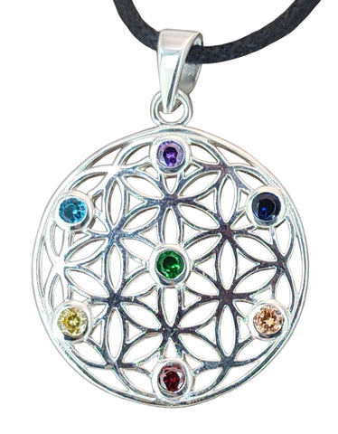 Kunstvoll gestaltete Lebensblume aus 925 Sterling Silber. Der Anhänger ist glatt poliert und mit sieben Zirkonia-Glitzersteinen verziert. Diese haben die Farben der sieben Chakren (Energiezentren des Körpers): lila, rot, hellblau, rosa, dunkelblau, grün und gelb.