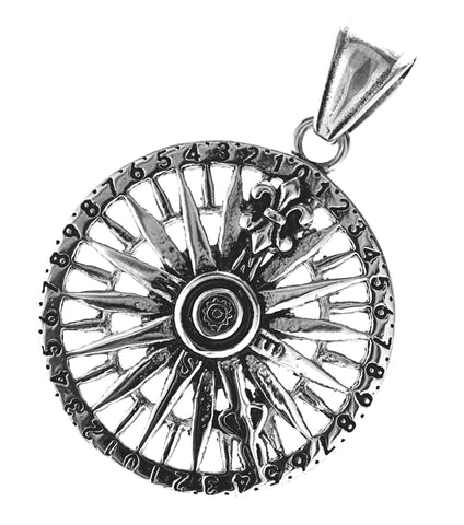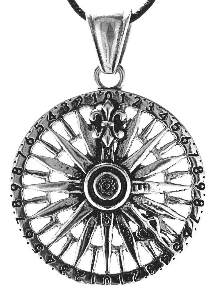 Kunstvoll gestalteter Kompass-Anhänger aus Edelstahl. Die Windrose ist mit einem Fleur-de-Lys verziert. Der Kettenanhänger ist teilweise geschwärzt.
