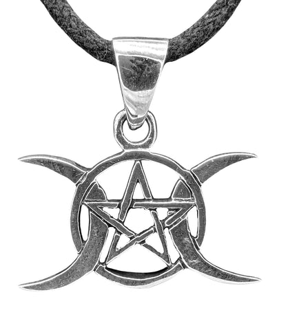 Das Dreiergöttin- oder auch Dreimond-Symbol setzt sich folgendermaßen zusammen: Das Zentrum des Anhängers bildet ein Pentagramm mit der Spitze nach oben, das von einem Ring umgeben ist. Diese Konstellation wird flankiert von zwei Mondsicheln.