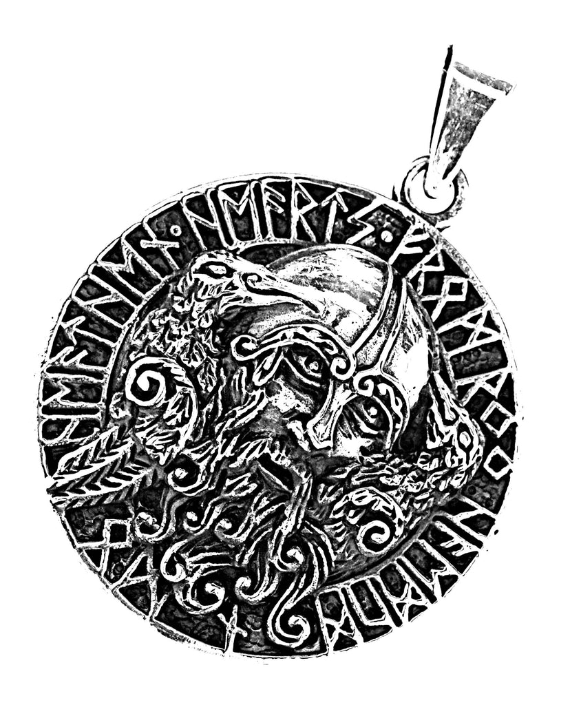 In der Mitte des Schmuckanhängers befindet sich ein Portrait Odins mit seinen Raben Hugin und Munin. Umgeben ist dieses Motiv von einem Runenring mit der Inschrift "Heathen Hearts".
