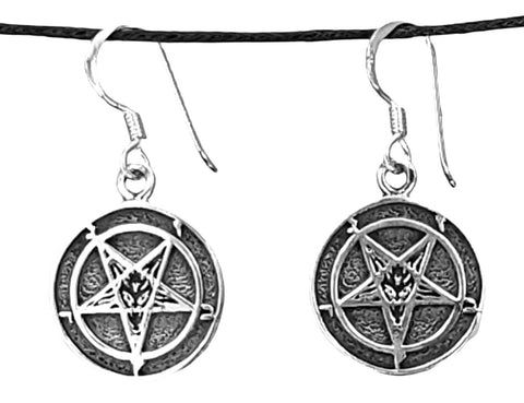 Kunstvoll gestaltete Baphomet-Ohrhänger aus 925 Sterling Silber. Das Pentagramm ist von einem Ring umgeben. Die Ohrringe sind auf der Vorderseite teilweise geschwärzt, sodass das filigrane Design optimal zur Geltung kommt.