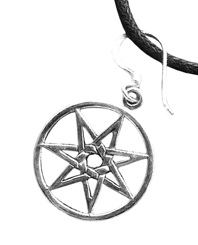 Der Ohrhänger präsentiert ein eindrucksvolles Heptagramm, einen siebenzackigen Stern. Die Vorderseite ist meisterhaft gearbeitet und weist dezente geschwärzte Bereiche auf, die die Konturen des Symbols betonen. Der siebenzackige Stern, eingebettet in einen eleganten Ring, verleiht dem Schmuckstück eine tiefe spirituelle Ästhetik.