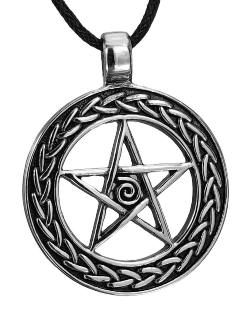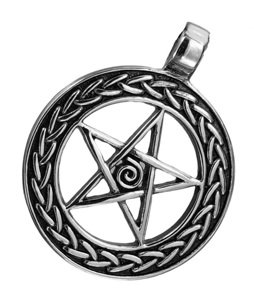 Großes, kunstvoll gestaltetes Pentagramm aus Edelstahl. In der Mitte des Pentakels befindet sich eine Spirale. Der äußere Ring ist mit Keltenknoten verziert.