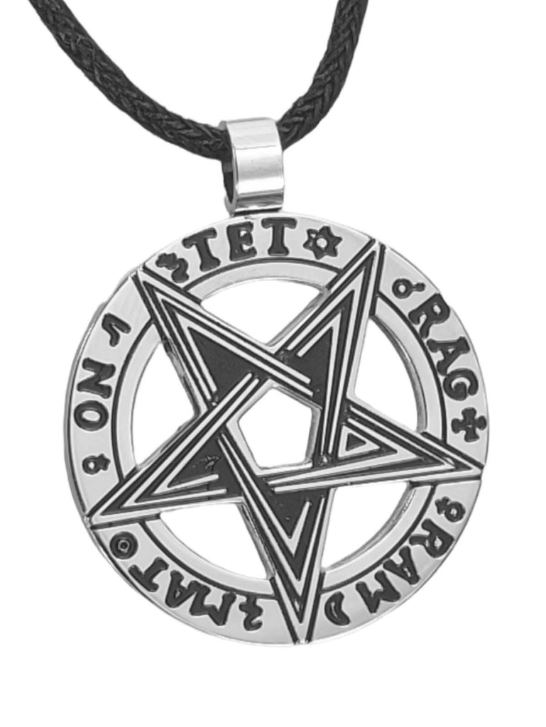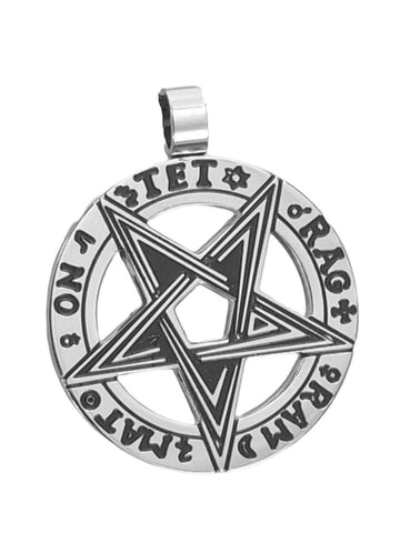 Kunstvoll gestaltetes Pentagramm aus Edelstahl. Der Kettenanhänger ist auf der Vorderseite teilweise geschwärzt, sodass das Design optimal zur Geltung kommt. Die Rückseite ist glatt poliert. Das Pentagramm ist von einem Ring umgeben, beschriftet mit den Silben Tet Rag Ram Mat On.