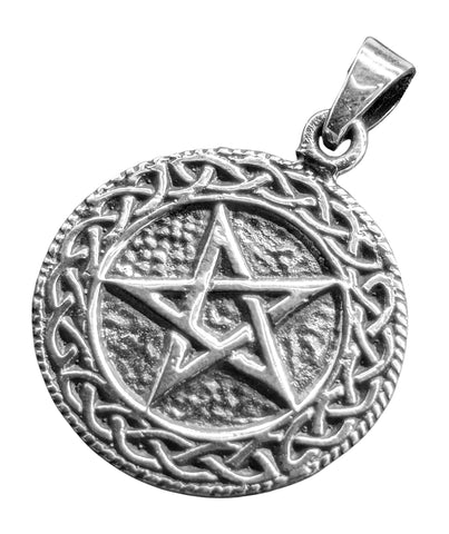 Kunstvoll gestaltetes Pentagramm aus 925 Sterling Silber. Das magische Symbol ist von einem Ring aus Keltenknoten umgeben. Der Anhänger ist auf der Vorderseite teilweise geschwärzt, die Rückseite ist geriffelt.