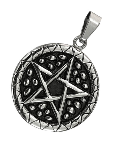 Kunstvoll gestaltetes Pentagramm aus Edelstahl. Der Kettenanhänger ist auf der Vorderseite teilweise geschwärzt. Der Hintergrund des Amuletts ist mit Tupfen verziert, der äußere Ring mit Zacken. Die Rückseite ist glatt poliert.