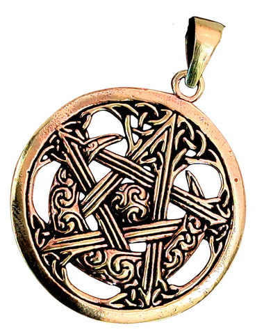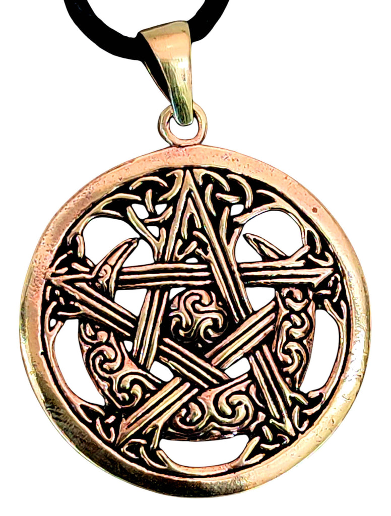 Kunstvoll gestaltetes Amulett aus Bronze. Hauptmotiv ist ein Pentagramm, dessen Spitzen mit Keltenknoten verziert sind. Integriert in das magische Symbol sind Sonne und Mond, wobei die Sonne nochmals mit einer Triskele verziert ist. Diese faszinierende Kombination ist umschlossen von einem schlichten Ring.
