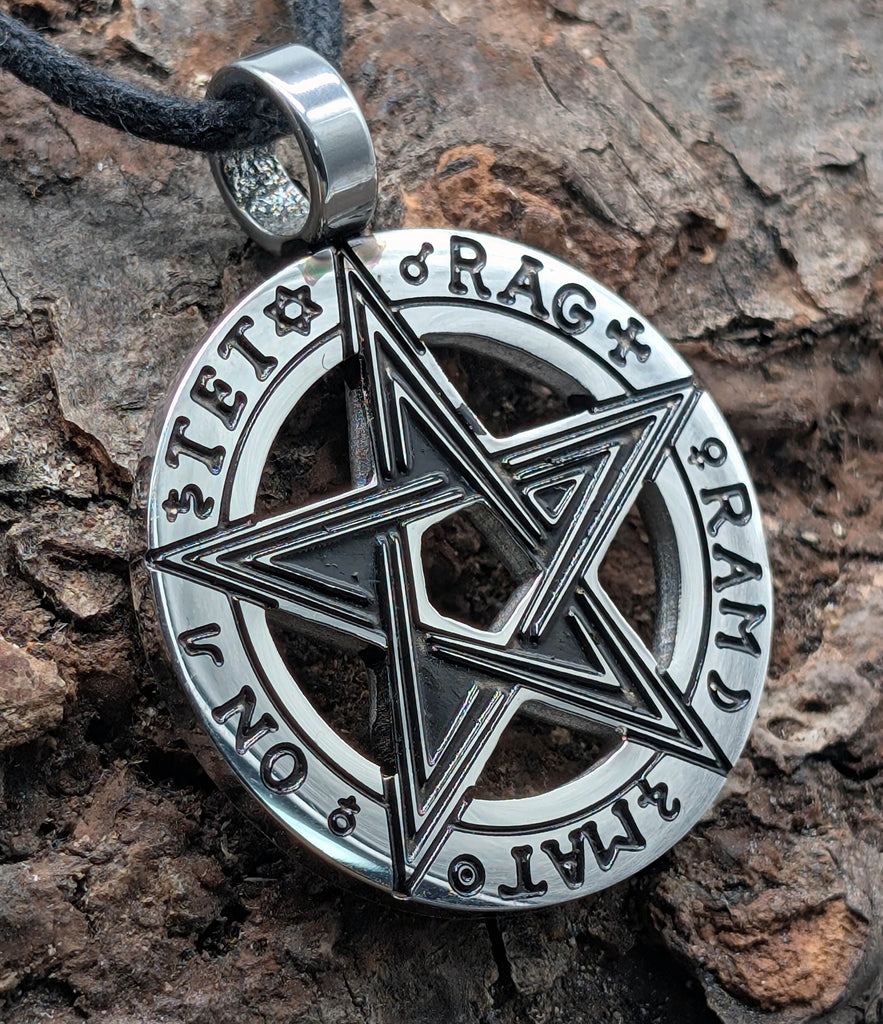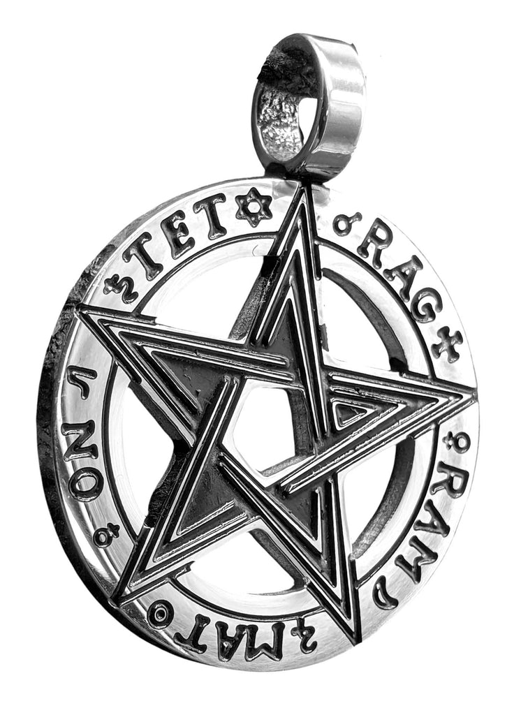 Kunstvoll gestaltetes Pentagramm aus Edelstahl. Der Kettenanhänger ist auf der Vorderseite teilweise geschwärzt, sodass das Design optimal zur Geltung kommt. Die Rückseite ist glatt poliert. Das Pentagramm ist von einem Ring umgeben, beschirftet mit den Silben Tet Rag Ram Mat On.