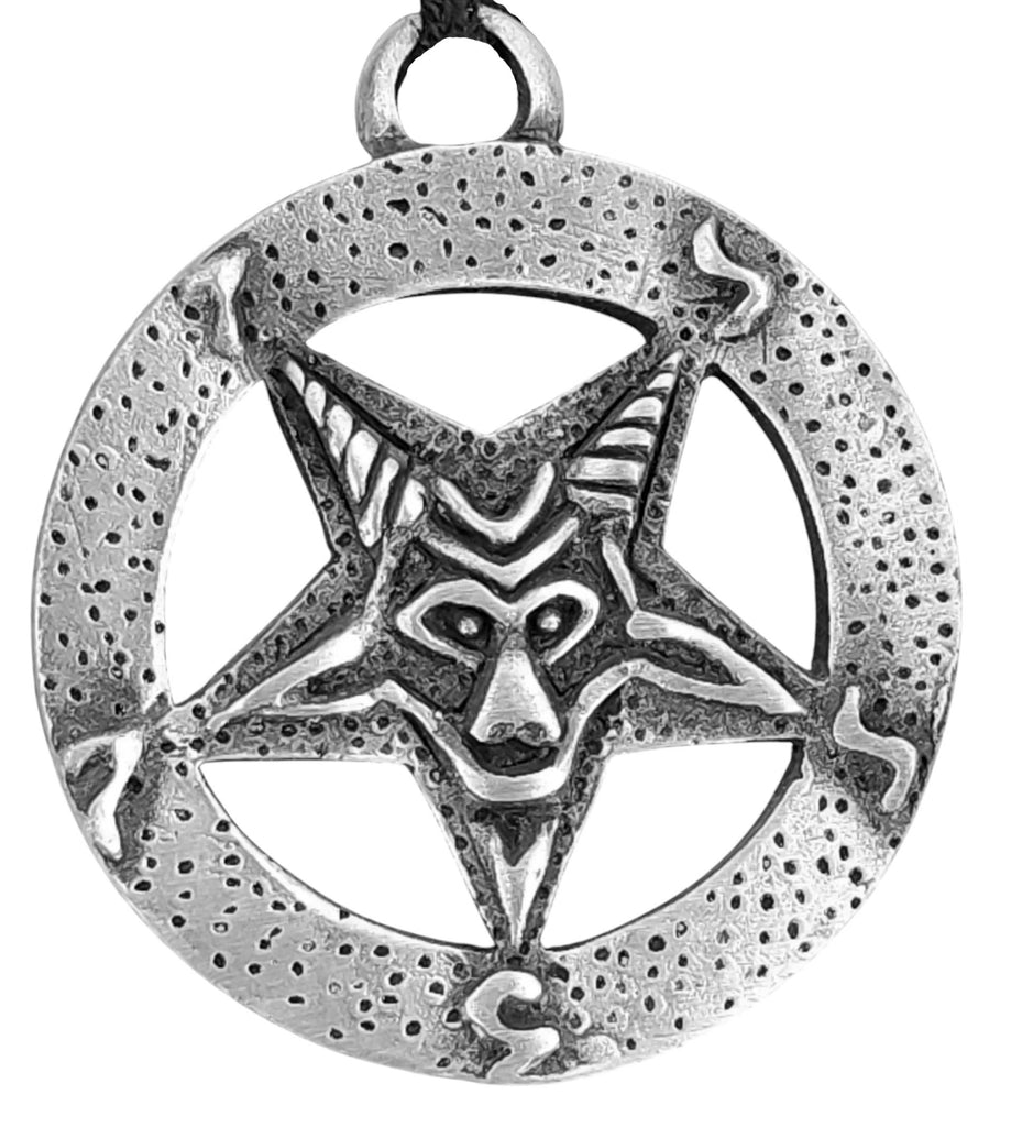 Kunstvoll gestalteter Anhänger aus Zinn/Pewter, Motiv "Baphomet". Der Kettenanhänger ist teilweise geschwärzt. Das Pentagramm ist von einem breiten Ring umgeben.