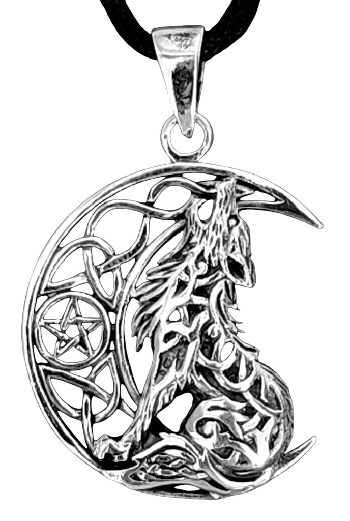 Sowohl die Mondsichel als auch der Wolf sind mit einem filigranen Knotenmuster verziert In den Mond ist außerdem ein Pentagramm eingearbeitet. Der Kettenanhänger ist teilweise geschwärzt.