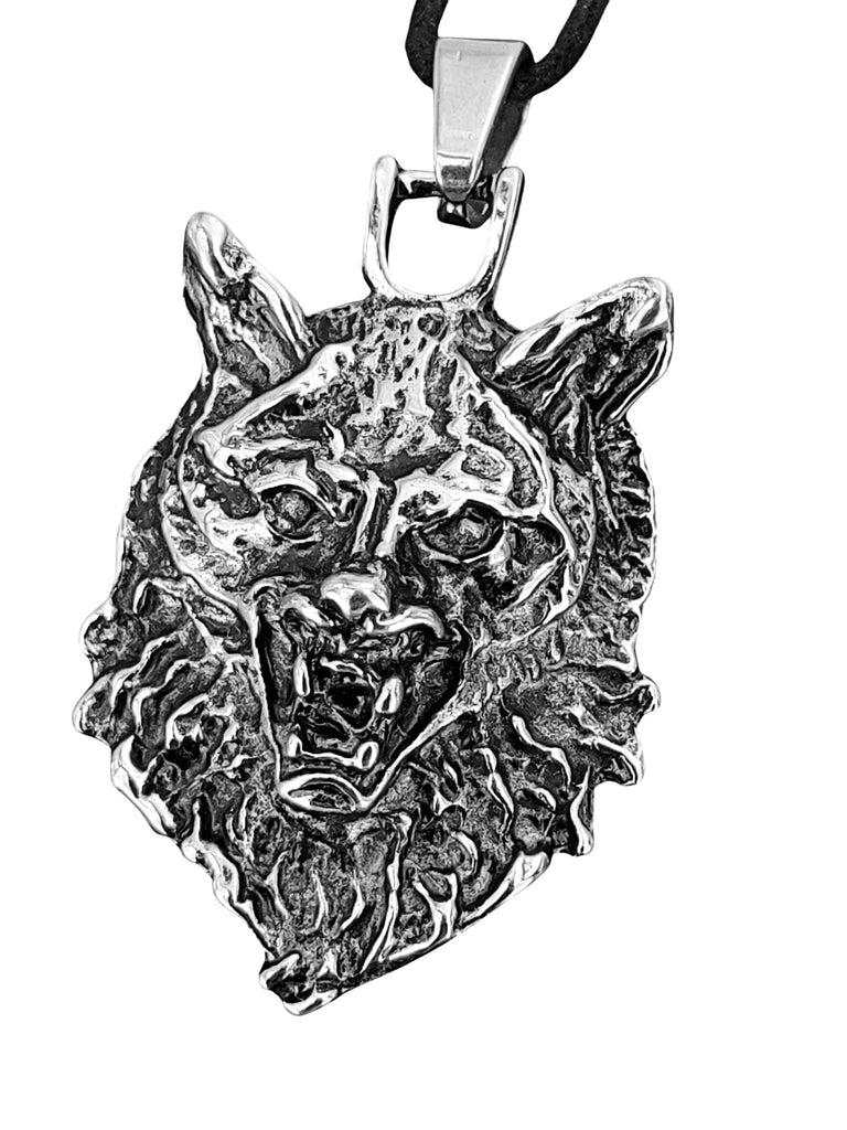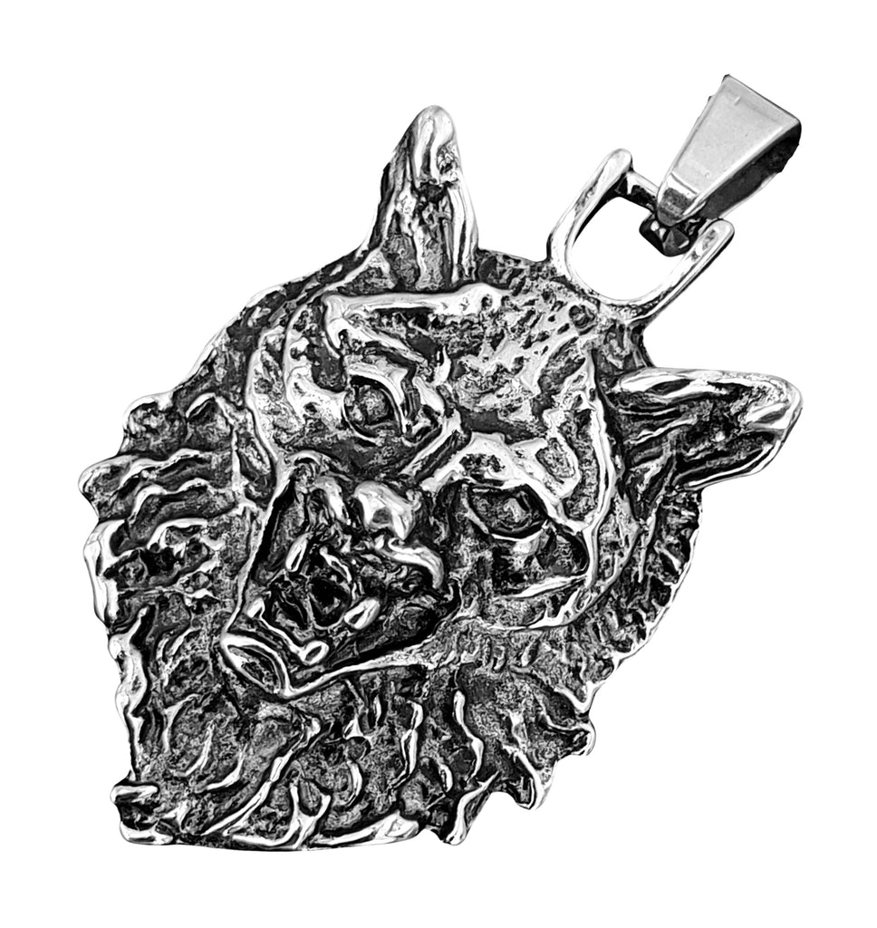 Dreidimensionaler, kunstvoll gestalteter Wolfskopf aus Edelstahl. Der Kettenanhänger ist auf der Vorderseite teilweise geschwärzt.