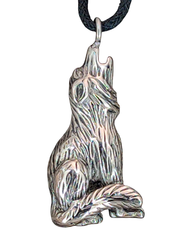 Plastisch gestalteter Wolf aus Edelstahl. Der Kettenanhänger ist auf Vorder- und Rückseite teilweise geschwärzt. Die Öse befindet sich oben an der Schnauze.
