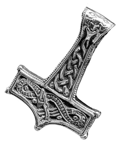 Der Hammer ist ist mit Keltenknoten und der Midgardschlange Jörmungandr verziert. Der Anhänger ist auf der Vorderseite teilweise geschwärzt, die Rückseite ist glatt poliert.