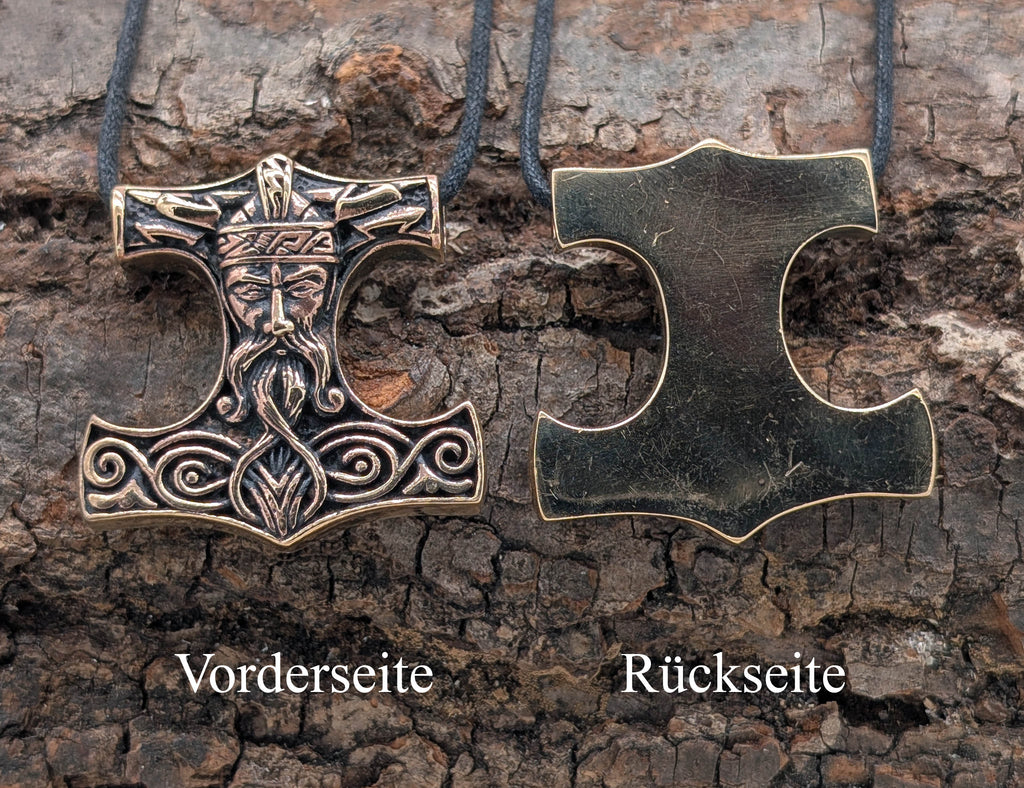 Der Hammer ist teilweise geschwärzt und mit Keltenknoten sowie dem Haupt Odins verziert. Die Rückseite des Anhängers ist nicht hohl, sondern geschlossen und glatt poliert.