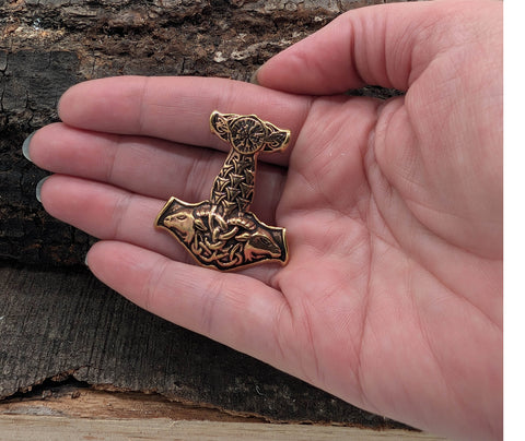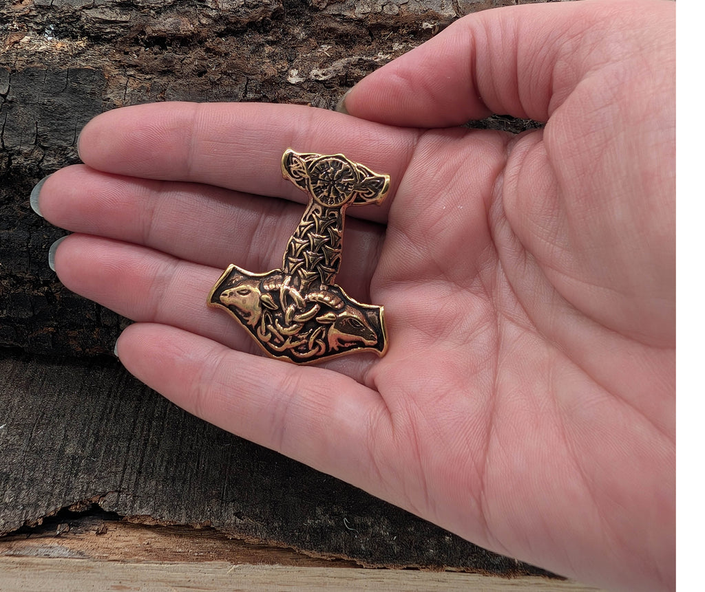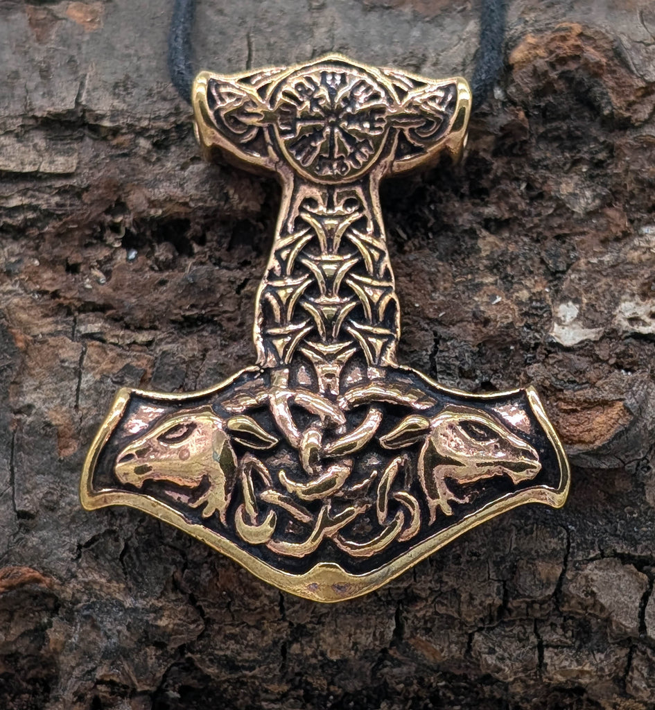 Der Hammer ist teilweise geschwärzt und mit einem Wikingerkompass und Ziegenköpfen verziert. Vorder- und Rückseite sind gleichermaßen sorgfältig ausgearbeitet, der Anhänger kann also beidseitig getragen werden.
