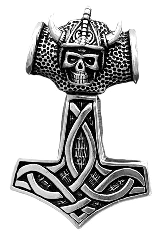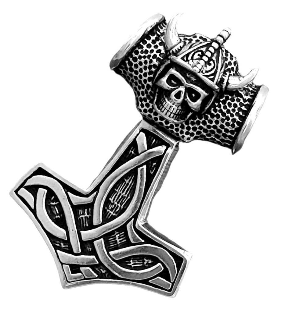 Großer, schwerer, hochwertig verarbeiteter Kettenanhänger "Thorshammer" aus 925 Sterling Silber. Der Hammer ist teilweise geschwärzt und mit Keltenknoten sowie einem Schädel mit Wikingerhelm verziert. Die Rückseite ist glatt poliert.