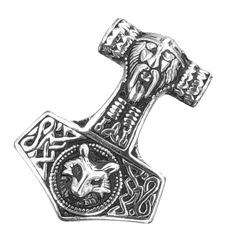 Der Hammer ist teilweise geschwärztund mit Keltenknoten, dem Haupt Odins sowie einem Wolfskopf verziert. Die Rückseite des Anhängersist glatt poliert.