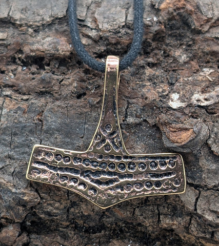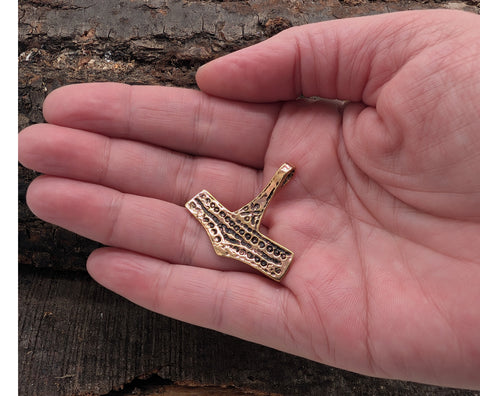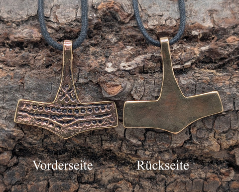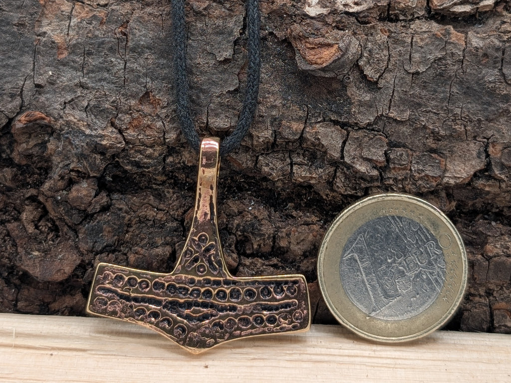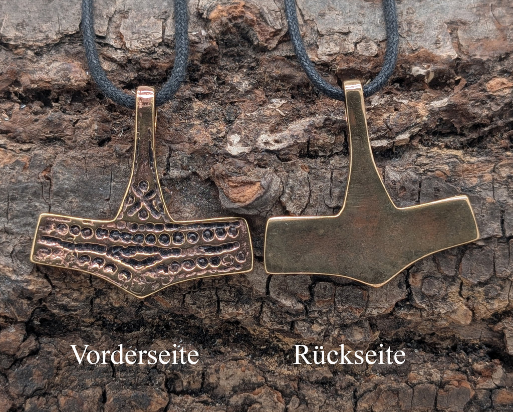 Sehr breiter, hochwertig verarbeiteter Kettenanhänger "Thorshammer" aus Bronze. Der Hammer ist teilweise geschwärzt, sodass das kunstvolle Punktemuster gut zur Geltung kommt.