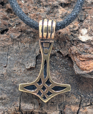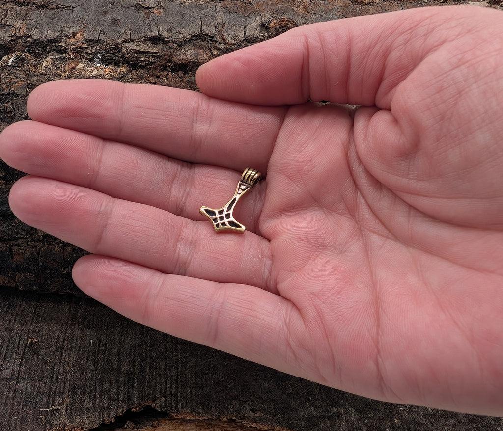Zierlicher, elegant geschwungener Thorshammer-Anhänger aus Bronze. Der Hammer ist teilweise geschwärzt, sodass das kunstvolle Knotenmuster gut zur Geltung kommt.