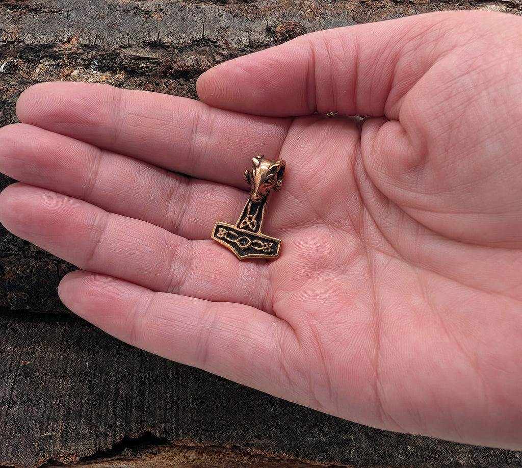 Massiver, hochwertig verarbeiteter Thorshammer-Anhänger aus Bronze. Die Öse ist aufwändig als Ziegenkopf gestaltet. Der Hammer ist auf beiden Seiten gleichsam sorgfältig ausgearbeitet und teilweise geschwärzt, sodass das kunstvolle Knotenmuster gut zur Geltung kommt.