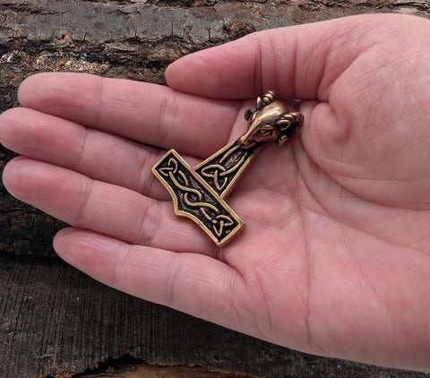 Massiver, hochwertig verarbeiteter Thorshammer-Anhänger aus Bronze. Die Öse ist aufwändig als Ziegenkopf gestaltet. Der Hammer ist auf beiden Seiten gleichsam sorgfältig ausgearbeitet und teilweise geschwärzt, sodass das kunstvolle Knotenmuster gut zur Geltung kommt.