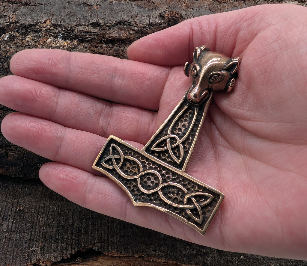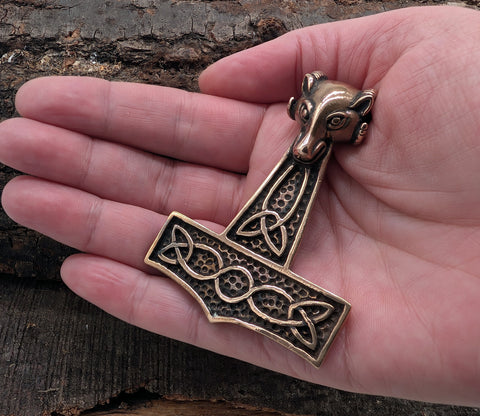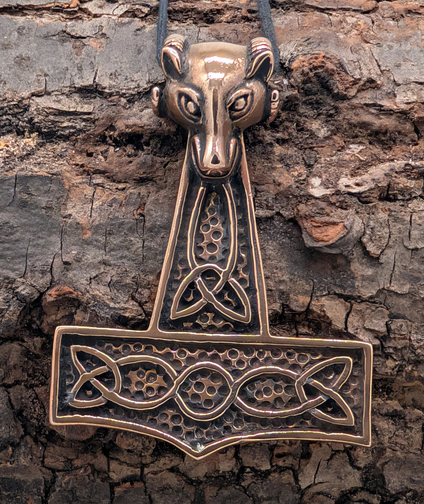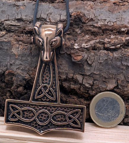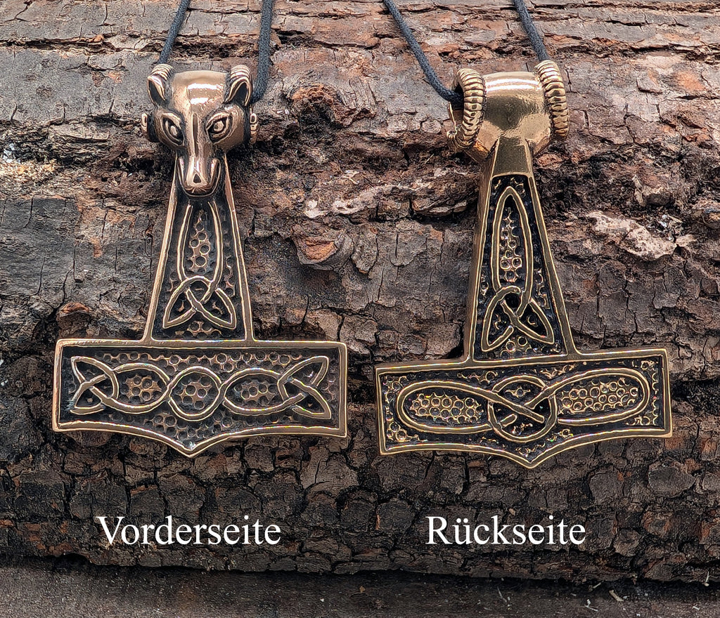 Sehr schwerer und massiver, hochwertig verarbeiteter Thorshammer-Anhänger aus Bronze. Die Öse ist aufwändig als Ziegenkopf gestaltet. Der Hammer ist teilweise geschwärzt, sodass das kunstvolle Knotenmuster auf beiden Seiten gut zur Geltung kommt.