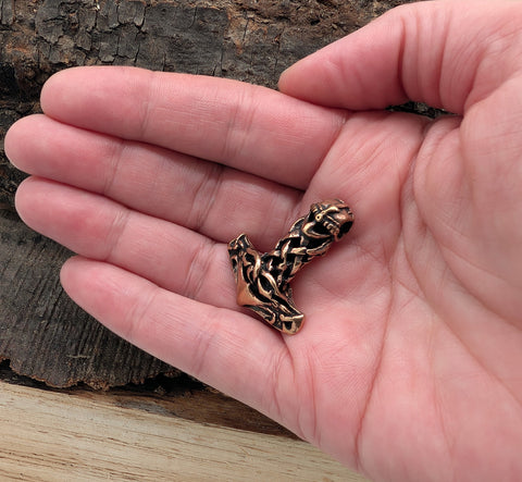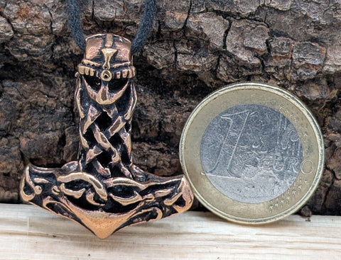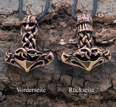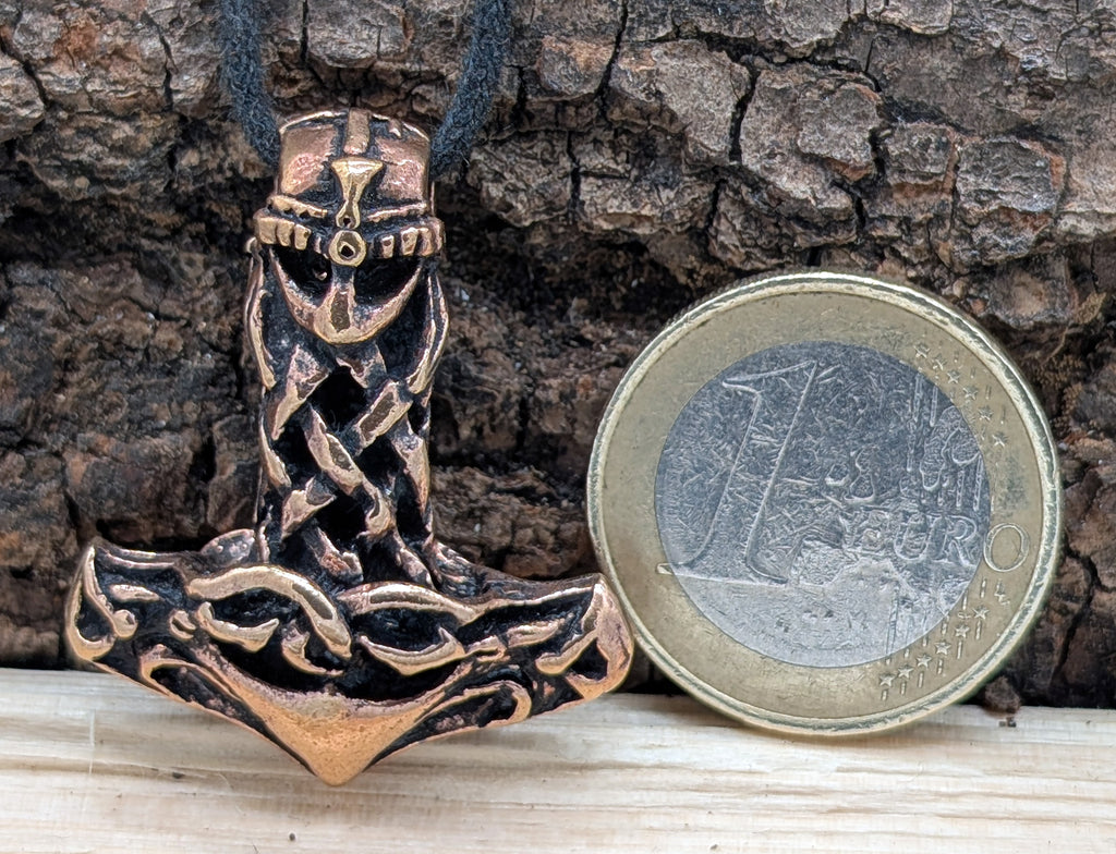 Schwerer, hochwertig verarbeiteter Thorshammer aus Bronze. Die Öse ist als Wikingerhelm gestaltet. Der Anhänger ist auf beiden Seiten gleichermaßen schön ausgearbeitet und teilweise geschwärzt, sodass die kunstvolle Knotenstruktur des Hammers optimal zur Geltung kommt.