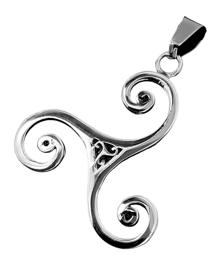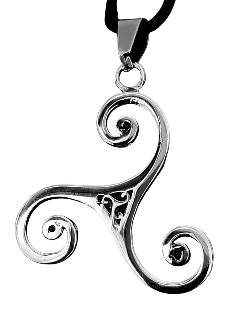 Großer, schön geschwungener Triskelen-Anhänger aus Edelstahl. In der Mitte des Anhängers befindet sich eine weitere kleine Triskele. Der Kettenanhänger ist auf der Vorderseite teilweise geschwärzt, die Rückseite ist glatt poliert.