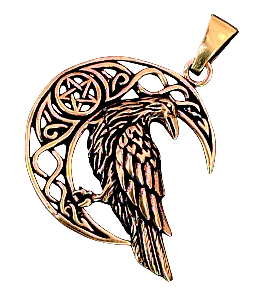 Kunstvoll gestalteter Raben-Anhänger aus Bronze. Der Vogel sitzt auf einer Mondsichel, die mit keltischen Knoten und einem Pentagramm verziert ist. Der Schmuckanhänger ist auf der Vorderseite teilweise geschwärzt, sodass das filigrane Design optimal zur Geltung kommt. Für Damen und Herren.