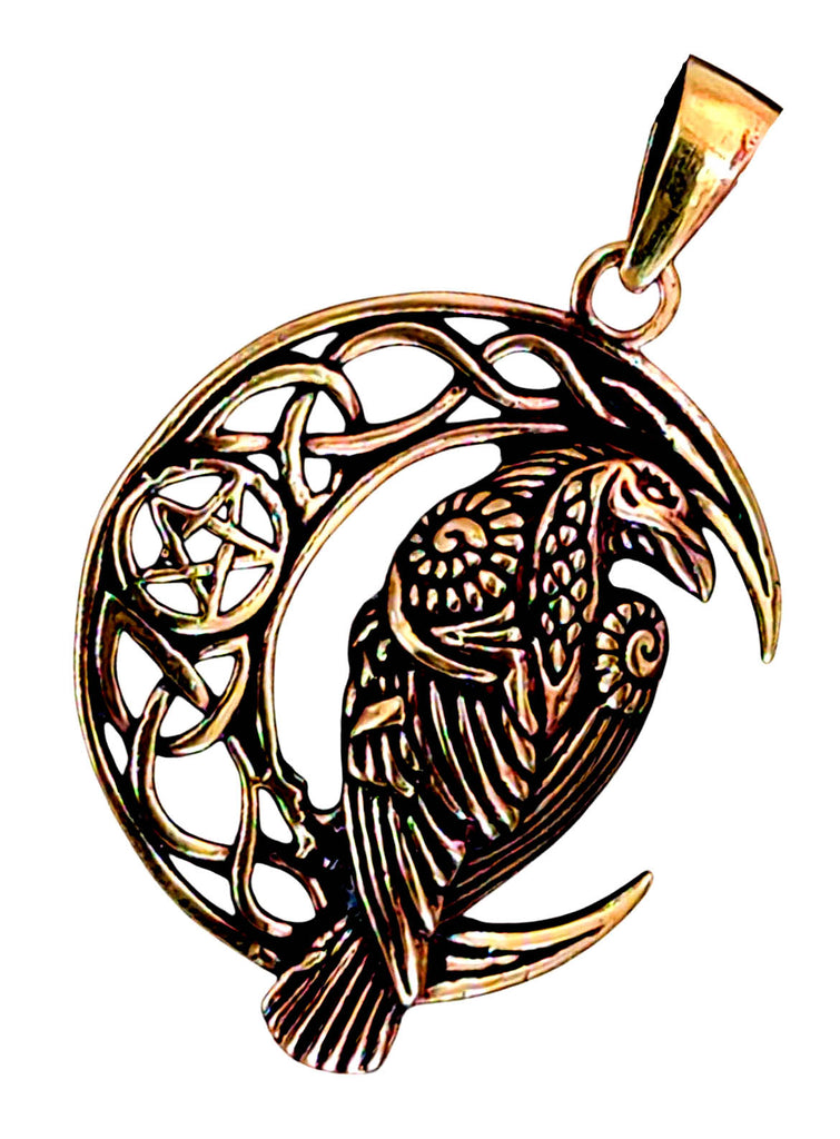 Kunstvoll gestalteter Raben-Anhänger aus Bronze. Der Vogel sitzt auf einer Mondsichel, die mit keltischen Knoten und einem Pentagramm verziert ist. Der Schmuckanhänger ist auf der Vorderseite teilweise geschwärzt, sodass das filigrane Design optimal zur Geltung kommt. Für Damen und Herren.