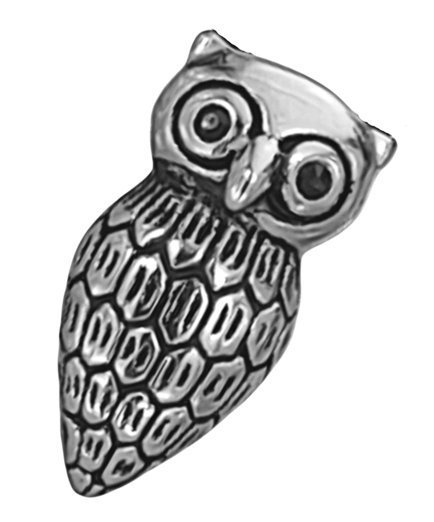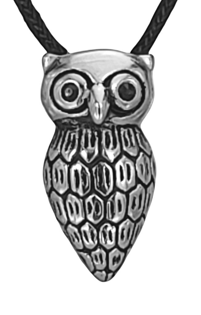 Kunstvoll gestaltete Eule aus Edelstahl mit großer Öse. Der Kettenanhänger ist auf der Vorderseite teilweise geschwärzt, die Rückseite ist glatt poliert. Die Öse befindet sich auf der Rückseite des Anhängers.